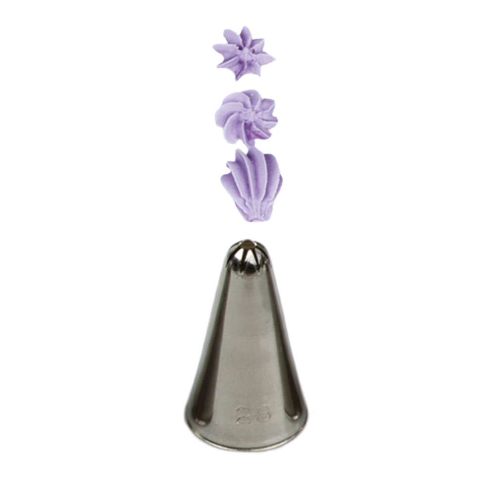Die Metall-Dekorierspitze 28 garantiert Ihnen eine präzise und einzigartige Dekoration. Die Spitze kann wiederholt mit dem Dekorationsbeutel verwendet werden. Sie ist aus rostfreiem Stahl gefertigt, es bleiben keine Fettflecken auf der Oberfläche. Nicht spülmaschinenfest.