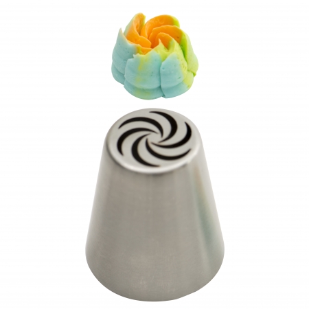 Metall-Dekorierspitze 8B, mit der Sie präzise und einzigartige Dekorationen herstellen können. Die Spitze kann wiederholt mit dem Dekorationsbeutel verwendet werden. Sie ist aus rostfreiem Stahl gefertigt, es bleiben keine Fettflecken auf der Oberfläche. Nicht spülmaschinenfest.