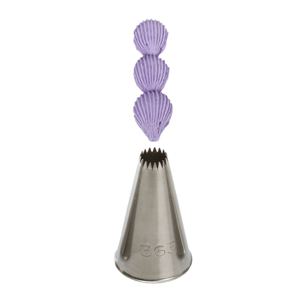 Eine Metall-Dekorierspitze mit dem Schnitt 363, die garantiert eine sehr präzise und einzigartige Dekoration schafft. Die Spitze kann wiederholt mit dem Dekorationsbeutel verwendet werden. Sie ist aus rostfreiem Stahl gefertigt, es bleiben keine Fettflecken auf der Oberfläche. Nicht spülmaschinenfest.
