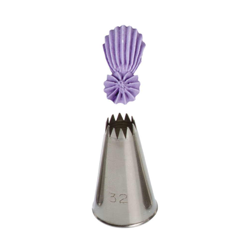 Metall-Süßwaren-Dekorspitze Schnitt 32, mit der Sie garantiert eine sehr präzise und einzigartige Dekoration schaffen. Die Spitze kann mit dem Dekorationsbeutel mehrfach verwendet werden. Sie ist aus rostfreiem Stahl gefertigt, es bleiben keine Fettflecken auf der Oberfläche. Nicht spülmaschinenfest.