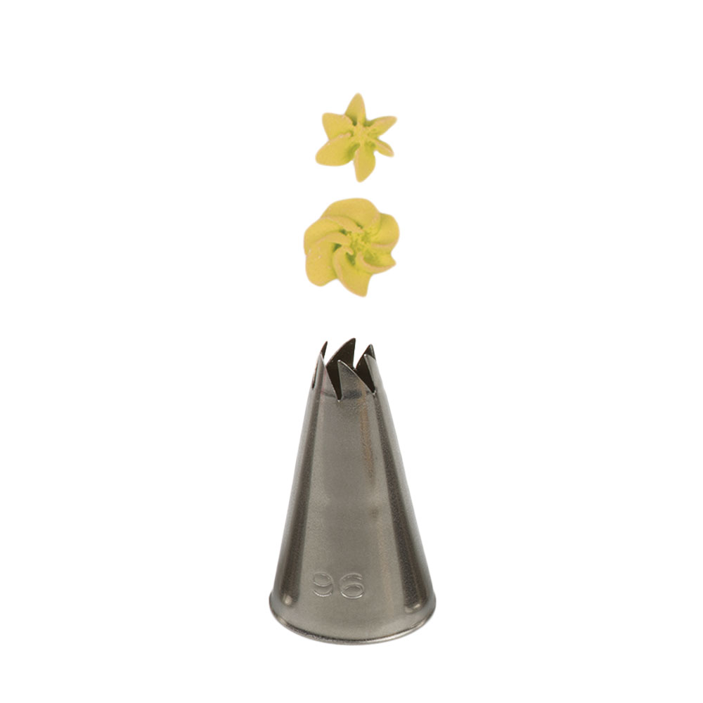 Metall-Dekorationsspitze Nr. 96 sorgt für eine präzise und einzigartige Verzierung. Die Spitze können Sie wiederholt mit einer Spritztüte verwenden. Sie ist aus Edelstahl gefertigt; auf der Oberfläche bleiben keine Fettflecken zurück. Nicht geeignet für die Spülmaschine.