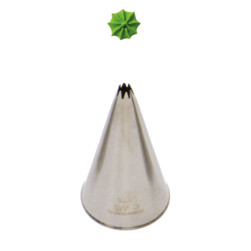 Metall-Patisserie-Tüllenspitze S/F3, gerade, garantiert präzise und einzigartige Verzierung. Die Spitze kann wiederholt mit einer Spritzbeutel verwendet werden. Sie ist aus Edelstahl gefertigt, Fettflecken bleiben auf der Oberfläche nicht haften. Nicht geeignet für die Spülmaschine.