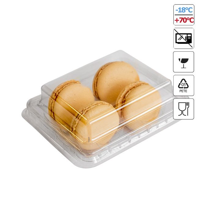 Elegante Kunststoffbox aus transparentem Material. Sie eignet sich für den Transport von 4 Stück Makronen, aber auch von Baisers und anderem zerbrechlichen Gebäck.