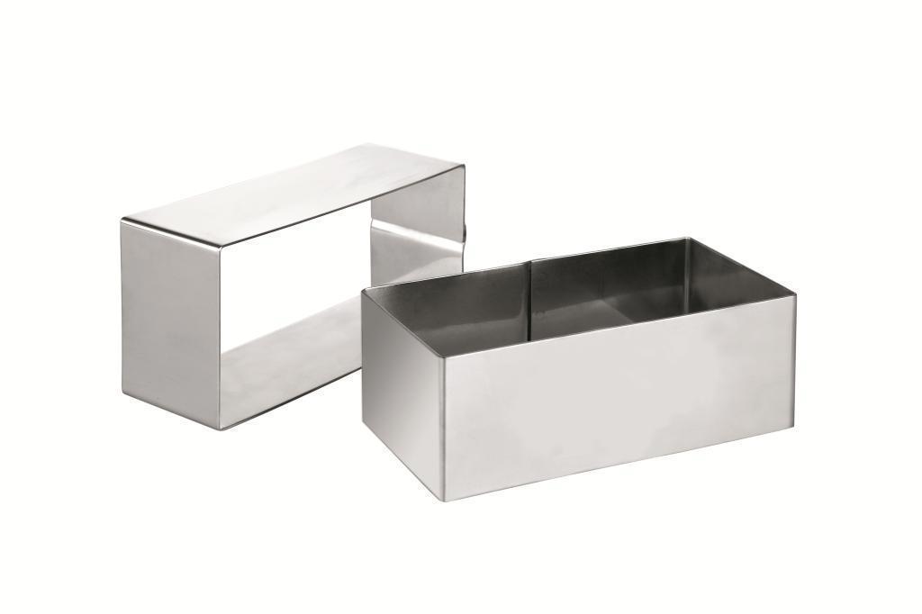 Ein modernes Produkt aus rostfreiem Stahl mit den Maßen 12x6cm. Das Produkt erreicht eine Höhe von 4,5 cm, was es nicht nur zum Formen von Lebensmitteln, sondern auch zum Tranchieren und in anderen Bereichen der Gastronomie nützlich macht. Die Schablone aus rostfreiem Stahl ist spülmaschinenfest.