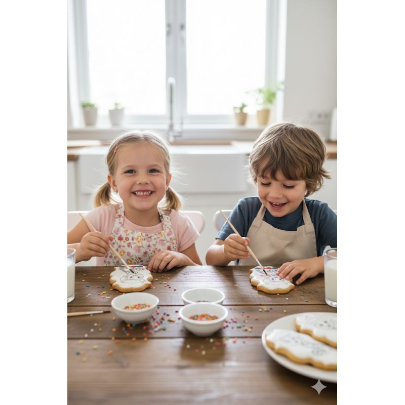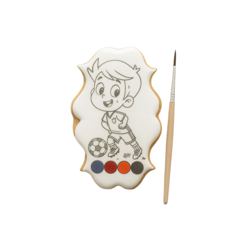 Duftender Lebkuchen mit dem Motiv eines Fußballers ist mit weißem Zuckerguss bedeckt und bereit zum Ausmalen mit essbaren Lebensmittelfarben. Zum Lieferumfang gehört auch ein Pinsel – einfach etwas Wasser und der kleine Fußballer erwacht in den Farben zum Leben, die die Kinder selbst auswählen.