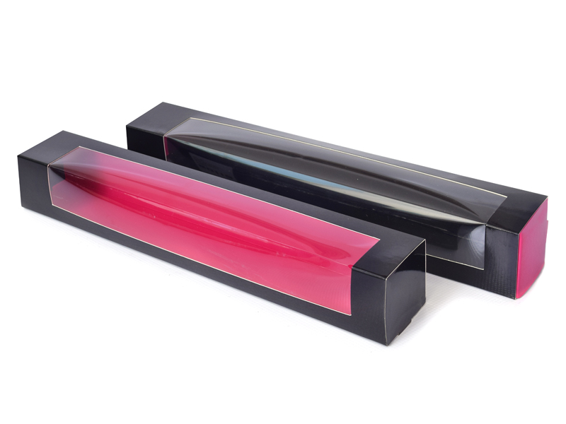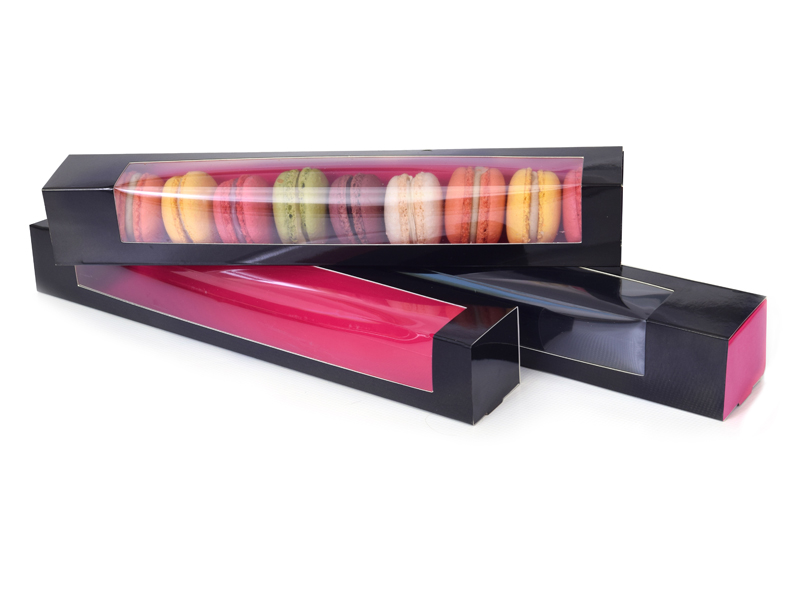 Die zweifarbige Makronenschachtel ist in Schwarz und Rosa gehalten. Sie fasst 6-9 Makronen und besteht aus zwei Teilen. Abmessungen 315x47x47mm mm.
