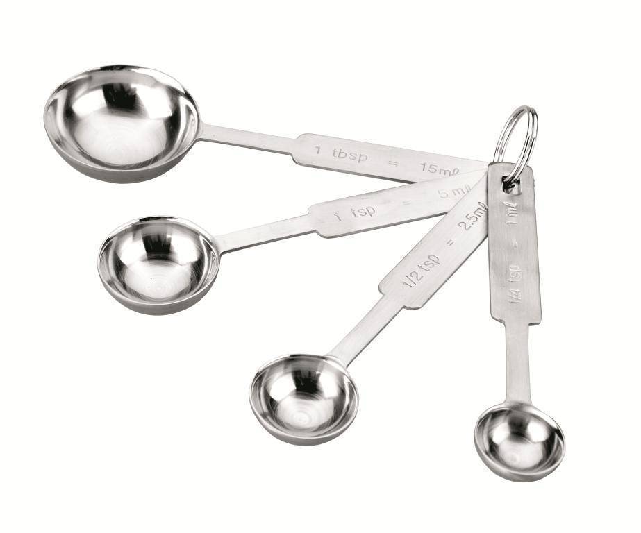 Set aus 4 Messbechern mit unterschiedlichem Volumen, hergestellt aus hochwertigem Edelstahl. Die Messbecher sind an einem gemeinsamen praktischen Griff, an dem das Set aufgehängt werden kann.