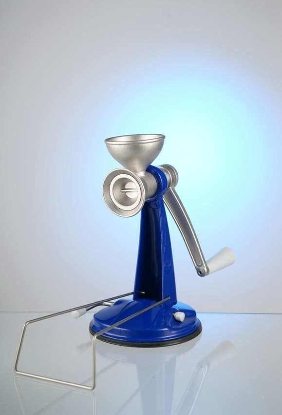 Eine traditionelle Mohnmühle, die durch einen Gummisauger auf einer glatten und sauberen Arbeitsfläche gehalten wird. Das notwendige Vakuum wird durch Drehen des Griffs erzeugt, der auch dazu dient, die Maschine nach dem Mahlen zu lösen. Die verwendeten Materialien sind Stahl, Gummi und Kunststoff. Frisch gemahlener Mohn verströmt sein unverwechselbares Aroma und hebt sich deutlich von gekauftem Mohn ab. Die blaue Farbe unterstreicht das elegante, traditionelle Design der Mühle, und die Metallhalterung macht es sehr einfach, eine Schüssel oder einen anderen Behälter für den gemahlenen Mohn direkt unter den Auslass zu stellen. Wenn man den Mohn erst kurz vor dem Backen mahlt, erhöht sich der kulinarische Wert der fertigen Speise zweifellos!"