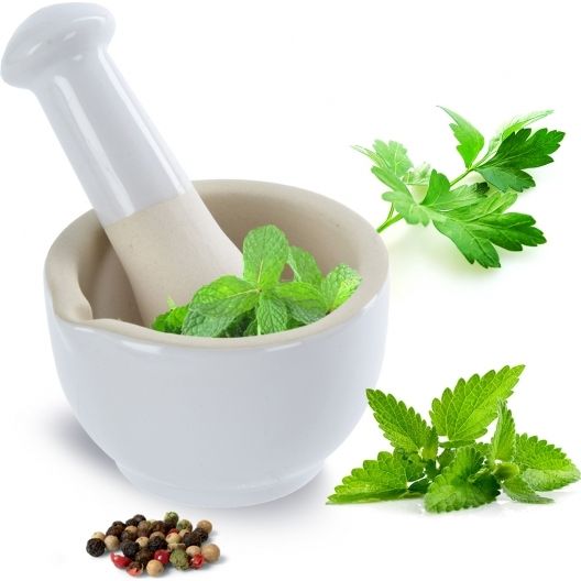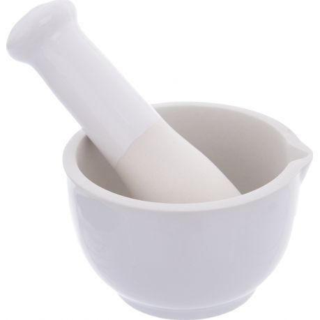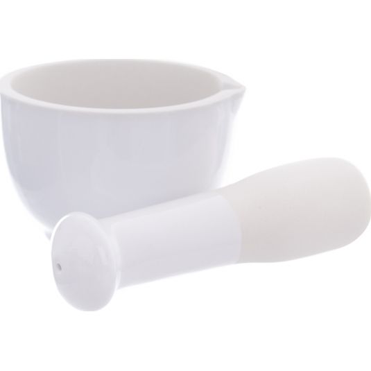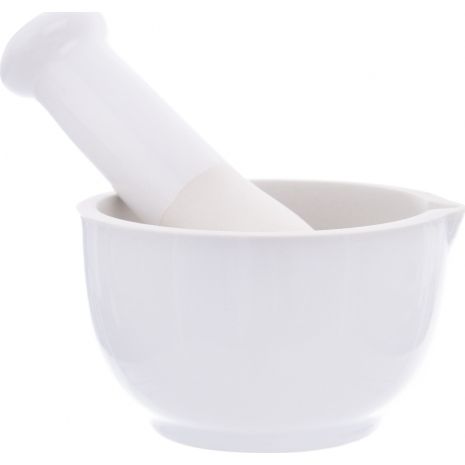 Mörser mit Ausgießer zum Zerkleinern von Gewürzen, Kräutern und zur Zubereitung von Pesto. Material: Steingut. Der innere Teil des Mörsers und die dickere Seite des Stößels sind unglasiert - für einen besseren Zerkleinerungseffekt. Maße: Innendurchmesser 7,5 cm, Außendurchmesser 9 cm, H. 6 cm, Länge des Hammers 12,5 cm.