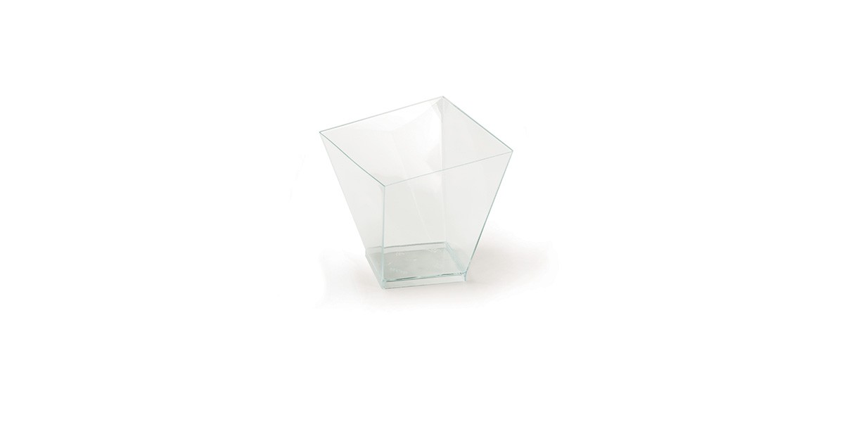 Der quadratische Becher hat abgeschrägte Seiten und dank des Produktionsmaterials (PS), das das Plexiglas ähnelt, reflektiert er das Licht auf interessante Weise und erzeugt schillernde Reflexe. Der Becher ist bis zu einer Temperatur von 40°C temperaturbeständig. Servieren Sie keine heißen Speisen darin. Abmessungen: 7,2 x 7,2 x 7,9 cm.