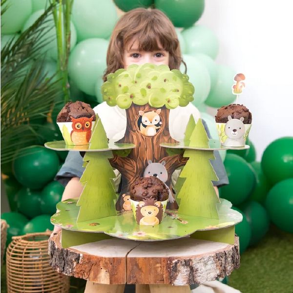 Präsentieren Sie die Muffins auf einer Party für die Kleinen auf diesem Ständer. Dieser Muffin- oder Keksständer ist ein Stück Wald mit einer majestätischen Eiche in der Mitte und Weihnachtsbäumen drum herum, die von Waldtieren bewohnt werden. Der Teller ist doppelseitig, auf jeder Seite warten andere Waldfreunde auf die Kinder.