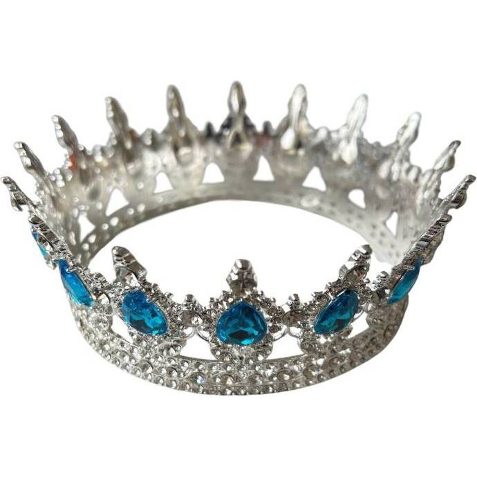 Nicht essbare Dekoration aus Metall, silberne Krone mit blauen Steinen in tränenförmiger Form