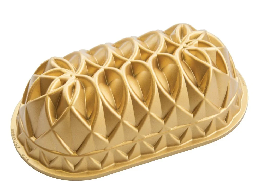 Die Sandwichform hat eine rautenförmige Form und ein elegantes goldenes Design. Die Form besteht aus gegossenem Aluminium, das feine Details und eine hervorragende Backleistung bietet. Durch die ausgeprägte Antihaftbeschichtung im Inneren ist die Backform einfach zu benutzen. Das robuste Aluminiumgussgefäß verteilt die Hitze schnell und gleichmäßig, um ein gleichmäßiges Backen zu fördern, was zu einer zarten goldenen Kruste führt. Nicht spülmaschinenfest. Abmessungen 29 x 16,2 x 7,3 cm.