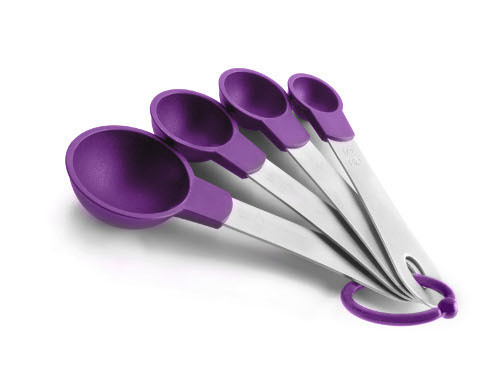 Vier praktische und sehr gut aussehende Messbecher aus Spezialnylon in den Größen eineinhalb Löffel und eineinhalb Teelöffel.