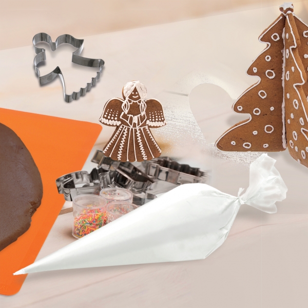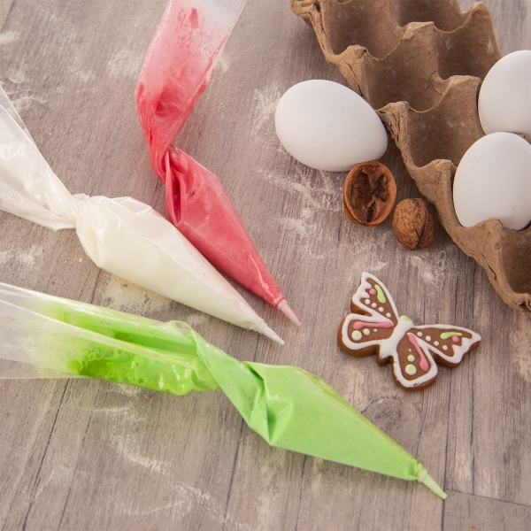Das Bemalen der Lebkuchen wird zum Kinderspiel, wenn man spezielle Beutel mit einer dünnen Plastikspitze verwendet, die eine präzise Linie beim Verzieren und Beschriften der Lebkuchen ermöglicht. Die Basis ist natürlich feiner, klumpenfreier Puderzucker in Kombination mit Eiweiß und einem Spritzer Zitrone.