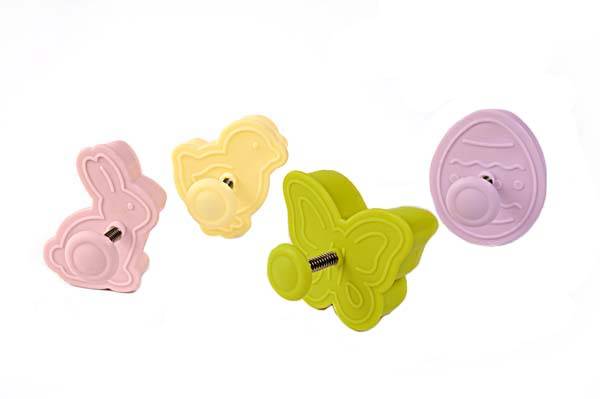 Ein Set von Ausstechern, mit denen Sie die Süßigkeiten ausstechen und gleichzeitig ein Muster darauf prägen können. Mit den Stempelausstechern können Sie die ausgestochenen Stücke auf das Backblech übertragen und dann den Stempel drücken, um das ausgestochene Stück leicht aus der Ausstechform herauszuheben. In diesem Set finden Sie vier österliche Ausstechformen aus stabilem, schön gefärbtem Kunststoff.