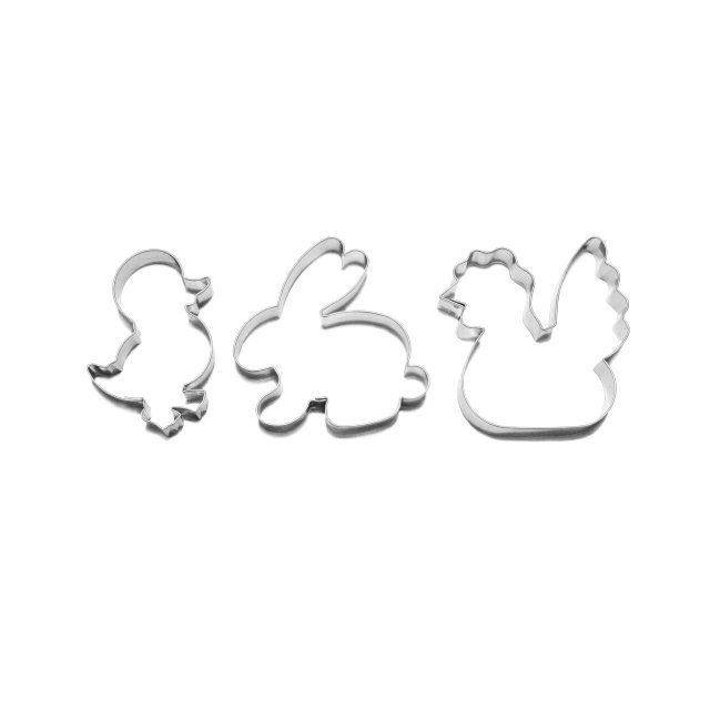 Set mit drei Ausstechformen aus Weißblech in Form von Ostertieren.