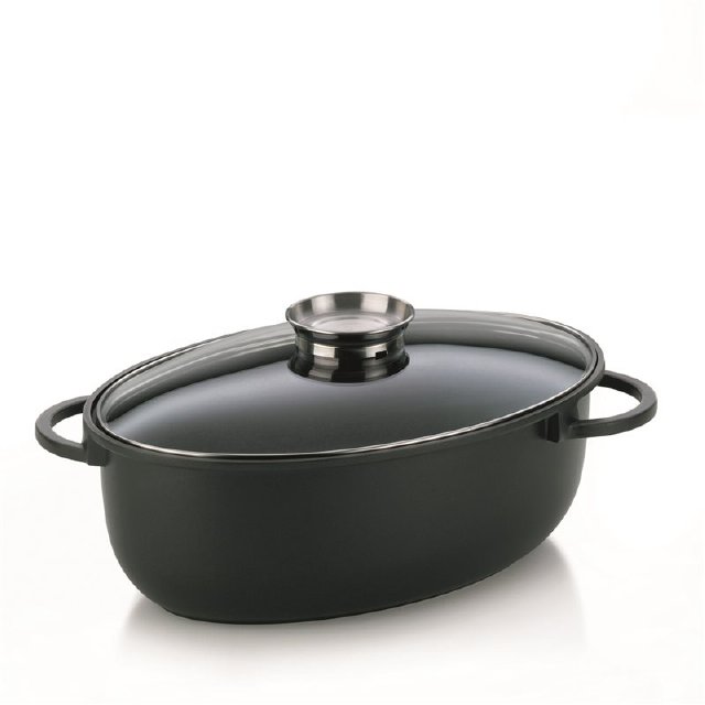 Aublatzunghalber ovalförmiger Bräter mit Glasdeckel, hergestellt aus extrudiertem Aluminiumguss, Wandstärke 5 mm. Der Bräter verfügt über eine hochwertige Antihaftbeschichtung GREBLON - C3. Dreischichtige, keramisch gefüllte Teflonbeschichtung ist kratzfest. Der Bräter ist außerdem mit einem Deckel ausgestattet.