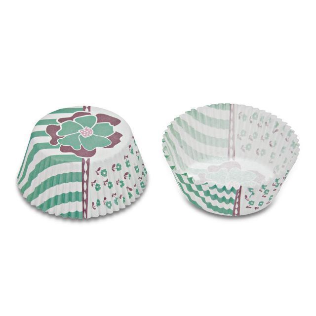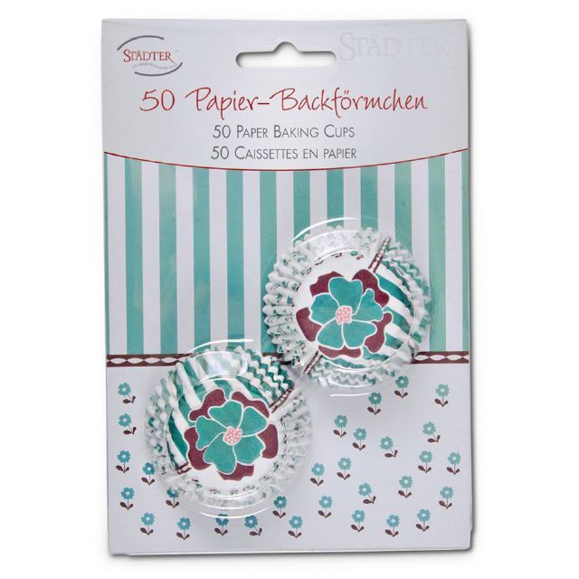 "Papier-Mini-Backformen - Becher mit türkisfarbenen Blüten und Streifen. Papierformen eignen sich zum Backen von Muffins und Cupcakes. Fülle die Förmchen immer nur zu 2/3 mit Teig, der Teig vergrößert beim Backen sein Volumen.