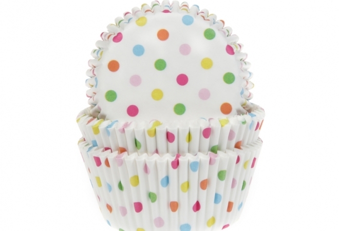 Ein Set mit 50 fantasievoll aussehenden Gebäck-Cupcakes für die einfache und schnelle Zubereitung von Mini-Desserts. Weiße Muffins mit Tupfen in Lila, Grün, Gelb und Blau.