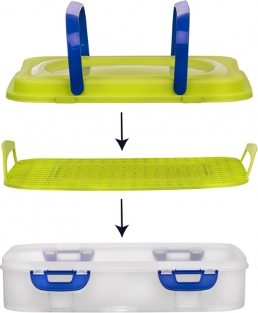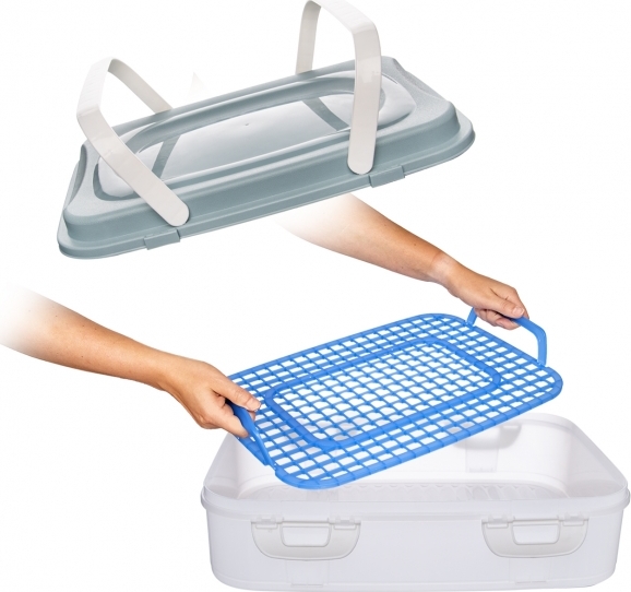 Zum Lieferumfang gehören ein Kunststoffgitter mit Griffen, die das Entnehmen des Inhalts erleichtern, und ein Kunststoffdeckel mit zwei Griffen, die das Tragen der Box erleichtern.