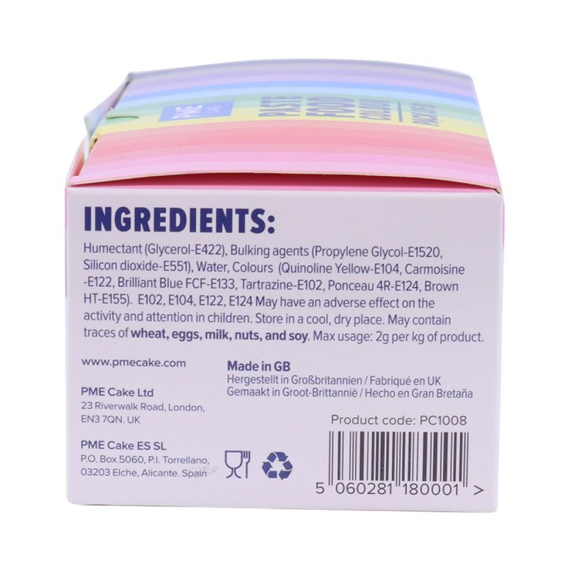 Zutaten: Altgold: Farbstoffe (E102, E155), Siliziumdioxid (E551), Propylenglykol (E1520), Glycerin (E422). Himbeerrot: Wasser, Siliciumdioxid (E551), Farbstoffe (E104, E124), Propylenglykol (E1520), Glycerin (E422). Hellgelb: Wasser, Kieselerde (E551), Farbstoff (E104), Propylenglykol (E1520), Glyzerin (E422). Mitternachtsschwarz: Wasser, Kieselerde (E551), Farbstoff (E104, E122, E133), Propylenglykol (E1520), Glyzerin (E422). Erbsengrün: Wasser, Kieselerde (E551), Farbstoff (E102, E104, E133), Propylenglykol (E1520), Glyzerin (E422). Tiefrosa: Wasser, Kieselerde (E551), Propylenglykol (E1520), Farbstoff (E124, E122), Glycerin (E422). Violett: Kieselerde (E551), Propylenglykol (E1520), Farbstoff (E124, E133), Glycerin (E422). Ozeanblau: Siliziumdioxid (E551), Propylenglykol (E1520), Glycerin (E422), Farbstoff (E133). Die Farbstoffe E102, E104, E110, E122, E124 und E129 können sich negativ auf die Aktivität und Aufmerksamkeit von Kindern auswirken. Dieses Produkt ist zertifiziert koscher und für Vegetarier und Veganer geeignet.