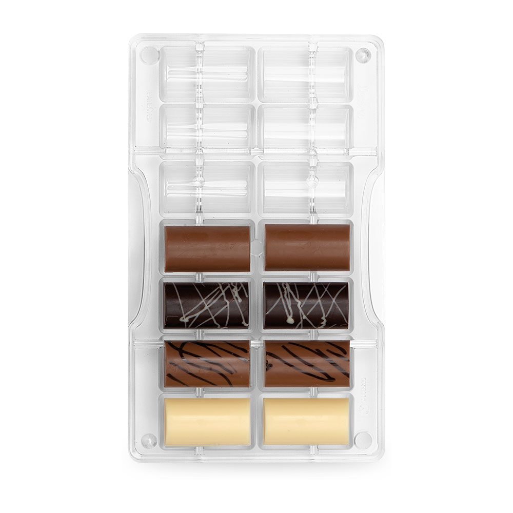 Professionelle Schokoladenform aus Polykarbonat von Decora. Hervorragende Form zum Gießen von Zylindern. In unserem Sortiment gibt es 3 verschiedene Zylindergrößen.