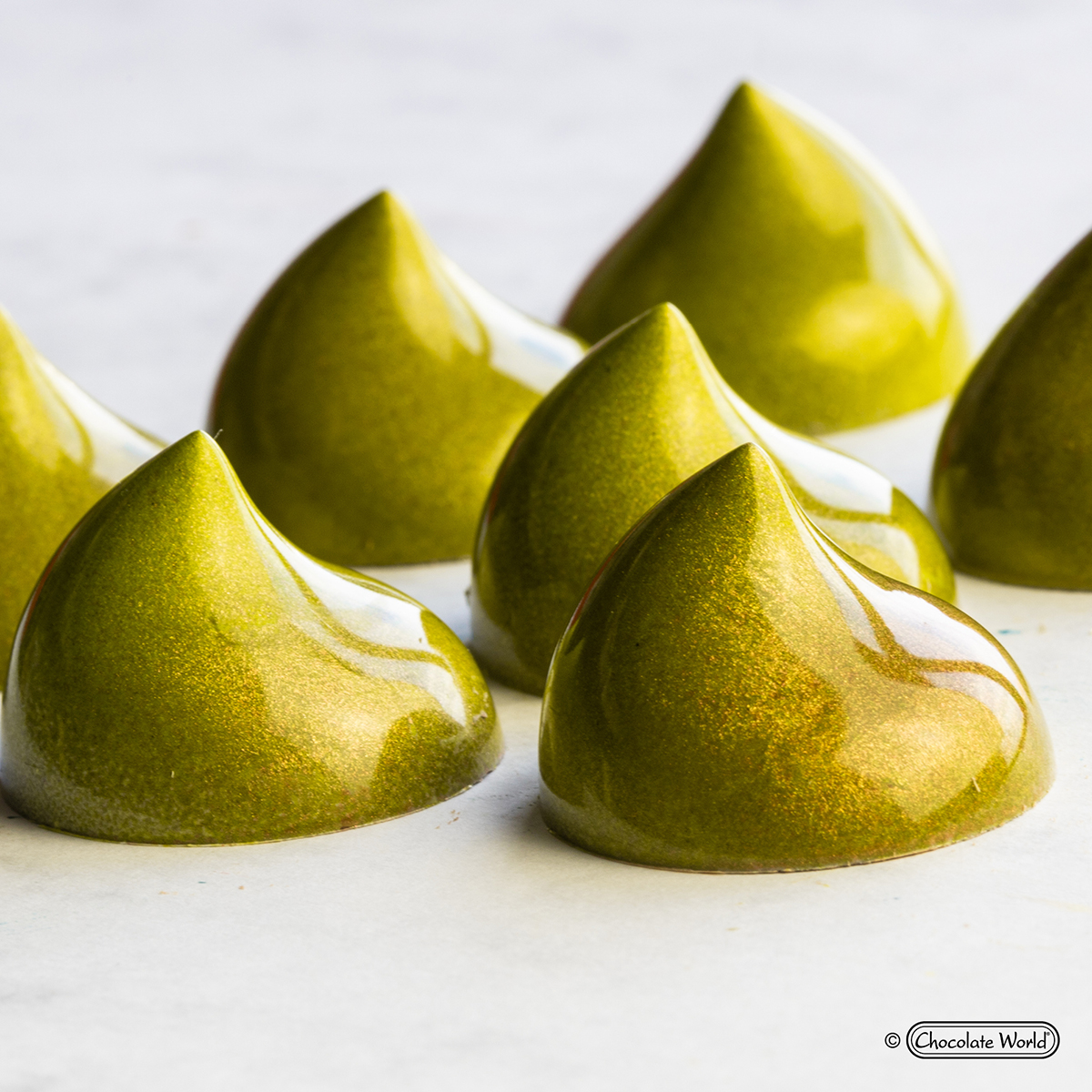 Polycarbonatform für die Herstellung perfekter Schokoladentrüffel. Diese hochwertige europäische Form ist einfach zu verwenden, Ihre Schokolade hat eine glänzende Oberfläche und hebt sich leicht ab. Um bunte Schokoladenstücke zu erhalten, bestreichen Sie Ihre Form mit einer dünnen Schicht farbiger Kakaobutterbevor Sie die Form mit Schokolade füllen. Diese Form wurde von Vivian Zhou entworfen. Abmessungen der Form: 275x135x24mm.
