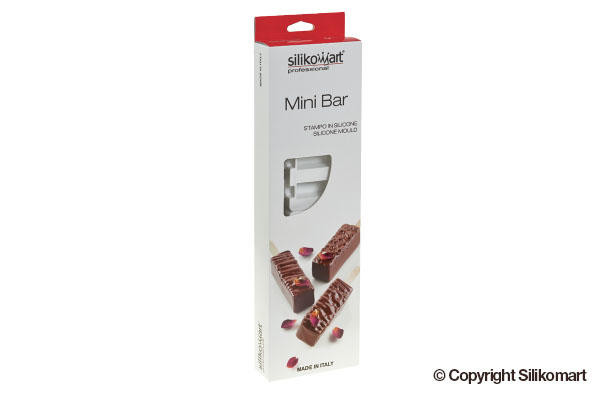Die perfekte Verschmelzung von geometrischen Formen und Eleganz schafft die Platin-Silikonformen Mini Bars, Mini Cues, die sich ideal für die Zubereitung raffinierter Einzelteile in Form von Würfeln, Halbzylindern und Rechtecken eignen.