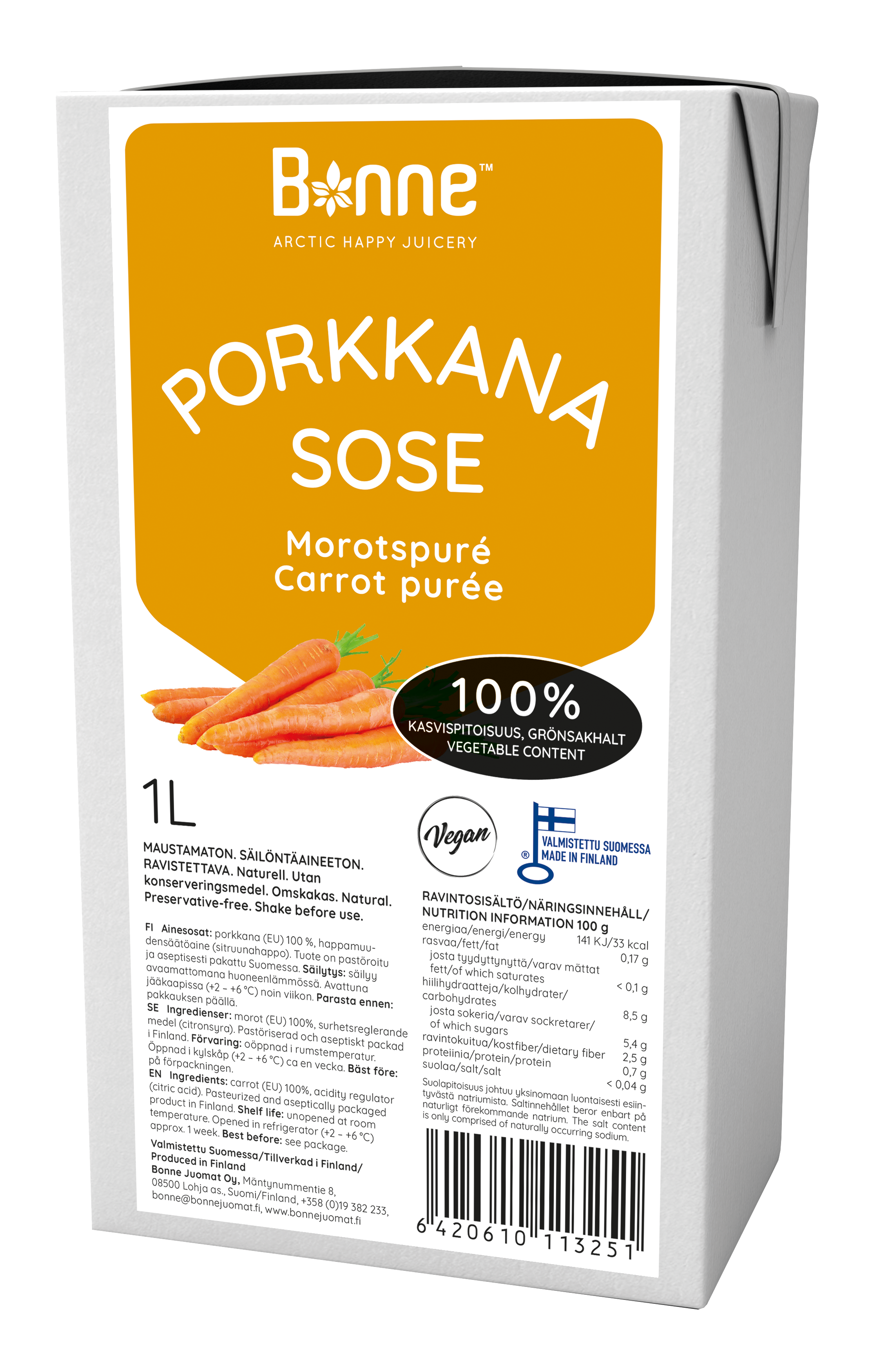 Karotte ist ein beliebtes und nahrhaftes Wurzelgemüse, das voller grundlegender Vitamine, Mineralien und Antioxidantien ist, wie Vitamin A, C und K. Sie ist in verschiedenen Farben erhältlich, einschließlich Orange, Violett und Weiß, von denen jede einzigartige gesundheitliche Vorteile bietet. Karotte ist auch ein vielseitiges Gemüse, das Sie roh, gekocht oder zu Saft oder Smoothie gemischt genießen können. Eine der wichtigsten gesundheitlichen Vorteile von Karotten ist ihr hoher Gehalt an Beta-Carotin. Beta-Carotin ist eine Art Carotinoide, die im Körper zu Vitamin A umgewandelt wird und für gesundes Sehen, Immunfunktion und Hautgesundheit notwendig ist. Karotte ist auch eine großartige Quelle für Ballaststoffe, die helfen können, die Verdauungsgesundheit zu verbessern und Sättigungsgefühle zu unterstützen. Darüber hinaus können die in Karotten enthaltenen Antioxidantien helfen, Zellen vor Schäden durch freie Radikale zu schützen, die zum Altern und zu Krankheiten beitragen können. Durch ihre süße und knackige Textur ist die Karotte eine köstliche und nahrhafte Ergänzung zu jeder Mahlzeit oder jedem Snack. Bonne Carrot Puree ist ungewürzt, ungesüßt, 100% reines Wurzelgemüse-Püree ohne Zusatzstoffe und Konservierungsstoffe. Es eignet sich für vielseitiges Kochen. Zutaten
