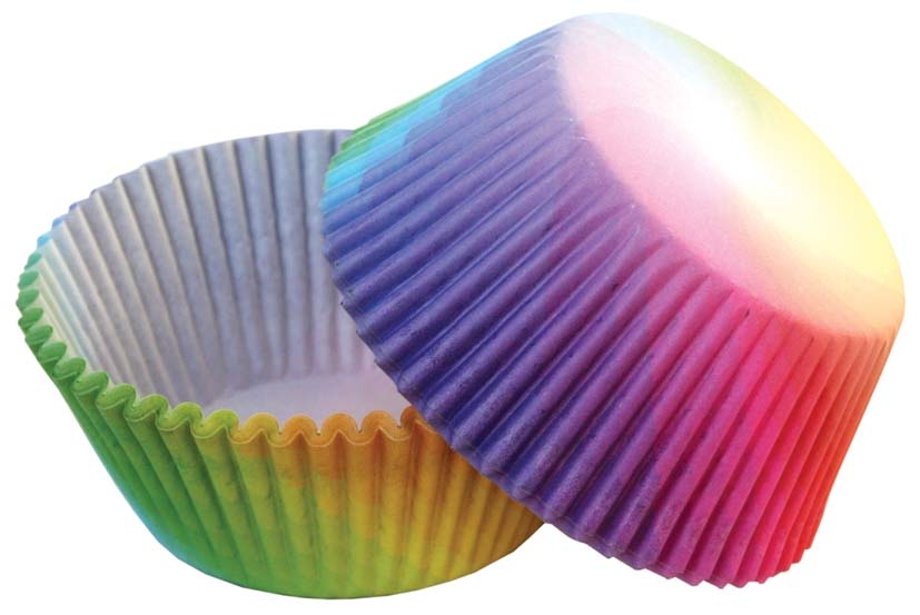 Muffin-Körbchen mit Regenbogen-Muster. Packung mit 50 Stück.