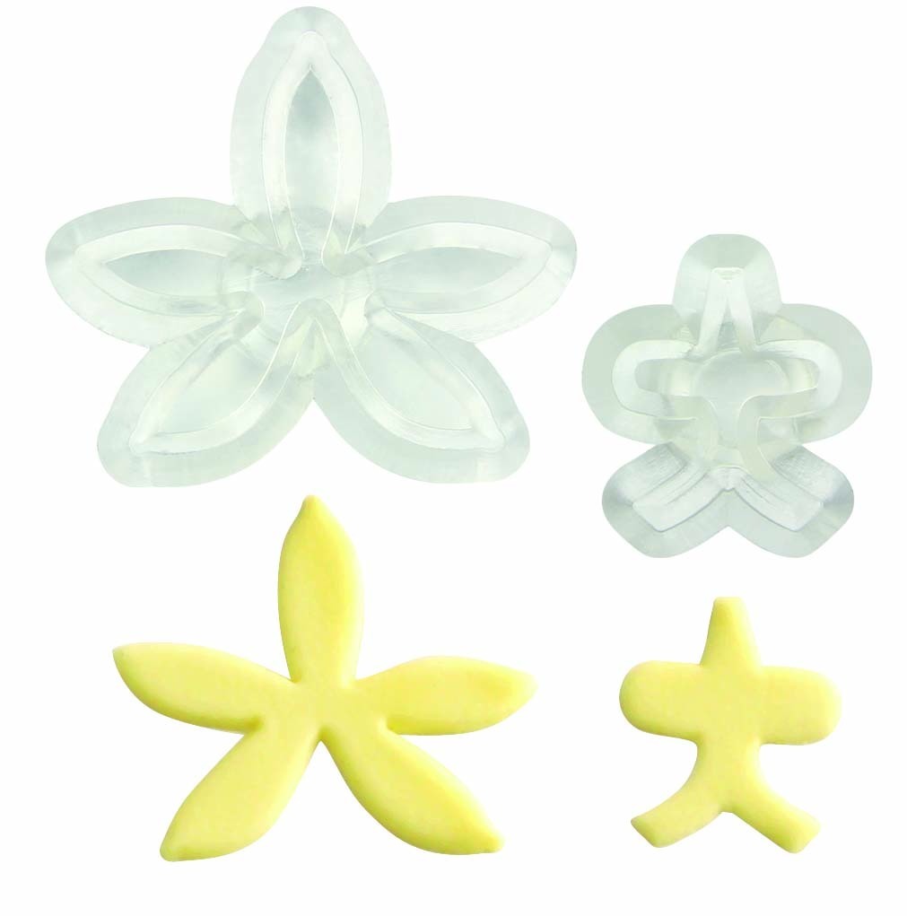 Verwenden Sie diese beiden Ausschnitte, um zwei Orchideenstücke herzustellen, die Sie dann zu einer schönen essbaren Dekoration zusammensetzen. Rollen Sie den Fondant oder Gumpaste zu einer dünnen Platte aus. Legen Sie die Ausschnitte auf eine rutschfeste Unterlage, legen Sie die Fondantplatte darauf und rollen Sie sie aus, bis die Formen ausgeschnitten sind. Dann die Ausschnitte einzeln abziehen und trocknen lassen, am besten auf einer unebenen Fläche, damit sich die Blütenblätter bilden können. Die Blume zusammensetzen (mit Drähten oder essbarem Kleber) und mit essbarer Farbe verzieren. Wir empfehlen, den Ausstecher vor dem Gebrauch einzufetten.