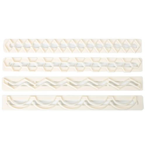Mit diesem Set können Sie wunderschöne dekorative Ränder kreieren, die Ihre Torte in ein echtes Kunstwerk verwandeln. Dieses Set enthält vier verschiedene Arten von Ausschnitten wie Rauten, Sparren, Kurven und Sechsecke. Die Aussparungen sind sehr einfach zu verwenden und ihre Unendlichkeit macht jede gewünschte Breite jeder Kuchengröße möglich.