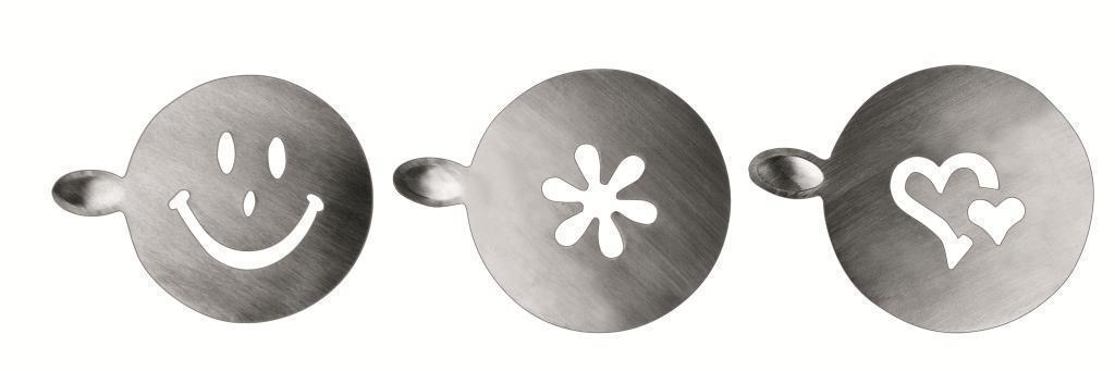 Eine perfekte und originelle Idee muss nicht immer kompliziert sein und komplizierte Lösungen mit teuren Werkzeugen beinhalten. In diesem Fall ist es eine sehr originelle Art, einer Tasse Cappuccino oder Kakao die eigene Seele einzuhauchen. Mit einer einfachen Schablone wird eines der drei angebotenen Motive, eine Blume, ein großes und ein kleines Herzmotiv oder ein Smiley, auf die Oberfläche des zubereiteten Getränks aufgebracht. Der Durchmesser der Schablone beträgt 10 Zentimeter, so dass sie praktisch in die meisten gängigen Becher passt. Wie erstellen Sie das Motiv? Halten Sie die Schablone fest über das Getränk und bestreuen Sie sie leicht mit z.B. feinem Kakaopulver, Zimt oder gemahlenem Kaffee.