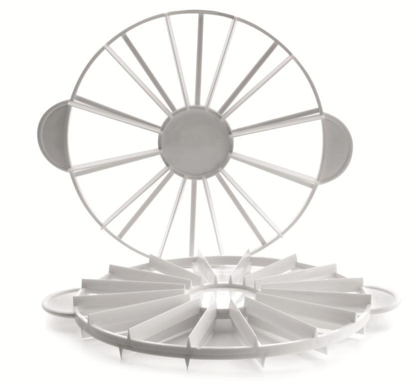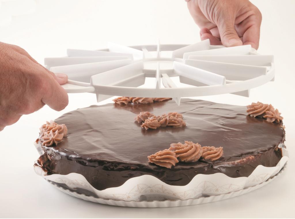 Wenn Sie eine Torte mit einem Durchmesser von maximal 26 cm kreieren, ist die Schablone zum Schneiden der Torte sehr nützlich, um die Anzahl der zu schneidenden Stücke zu bestimmen. Die Kunststoffeinheit verfügt über zwei Griffe, die das Einschieben in die Torte erleichtern. Hochwertiges Produkt. Es schneidet 10 bis 12 Stücke.