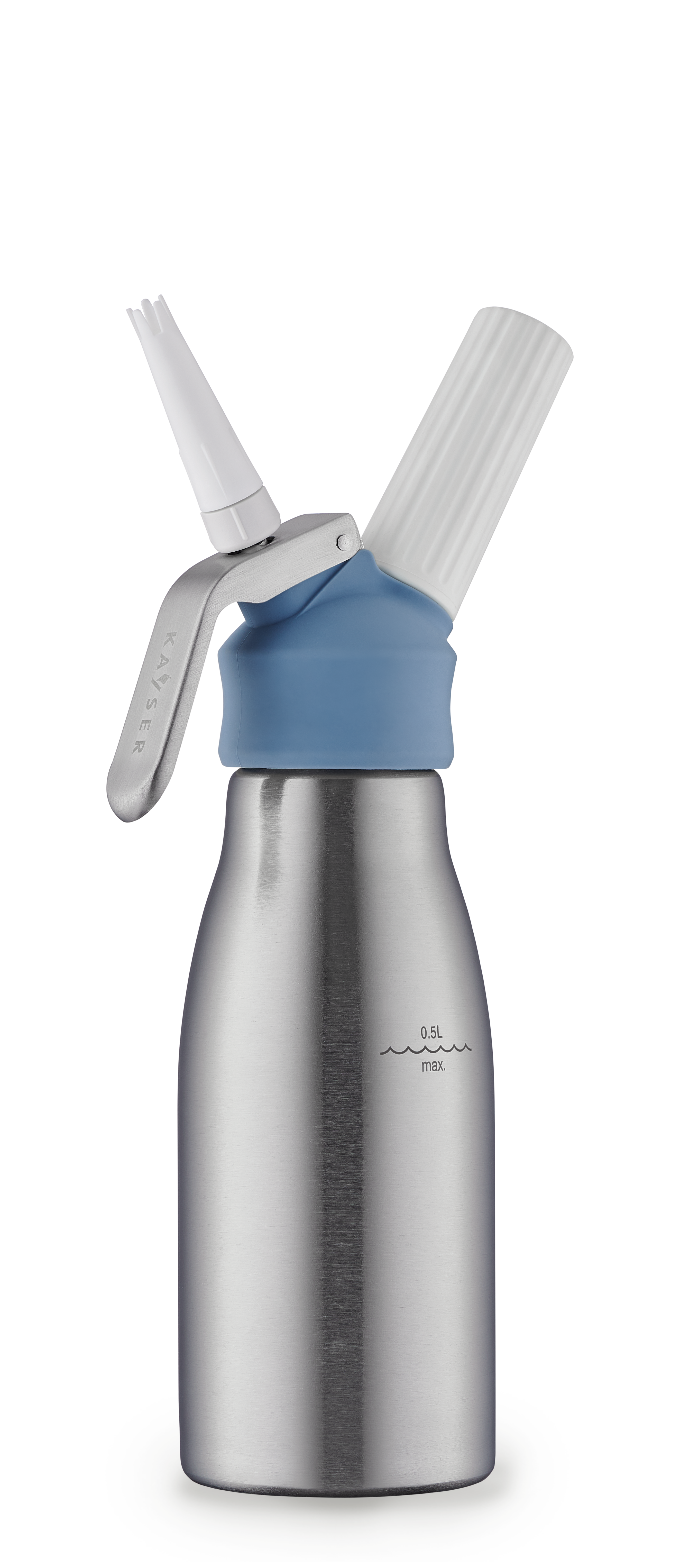 Stylische Schlagsahne-Flasche Kayser WHIPcreamer Harmony 0,5 l in eleganter Blauton vereint Spitzenqualität, Sicherheit und schönes Design – ideal für perfekt luftig geschlagene Schlagsahne und moderne Schaum.