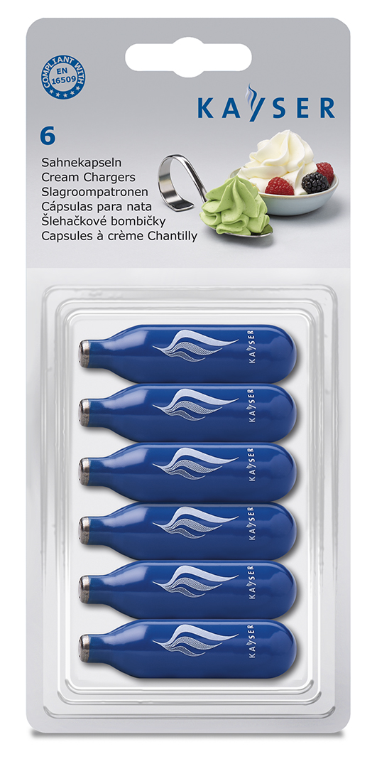 Universelle Einweg-Sahnebomben werden in der Tschechischen Republik hergestellt. Zum Beispiel: Kayser, Tescoma (Verkauf/Modell seit 2017), Liss, Mosa, Hendi, ISI, Orion, Banquet (Verkauf/Modell seit 2019) und andere Marken. Es wird nur 1 Flasche benötigt, um 0,5 l Sahne aufzuschlagen. Die Reinheit des N2O-Gases im Schlagsahne-Spender beträgt 99,95%. Die Schlagsahne-Spender sind aus recycelbarem Stahl hergestellt. Dieses Modell ist in blauer Farbe. Sie sind nicht nachfüllbar.