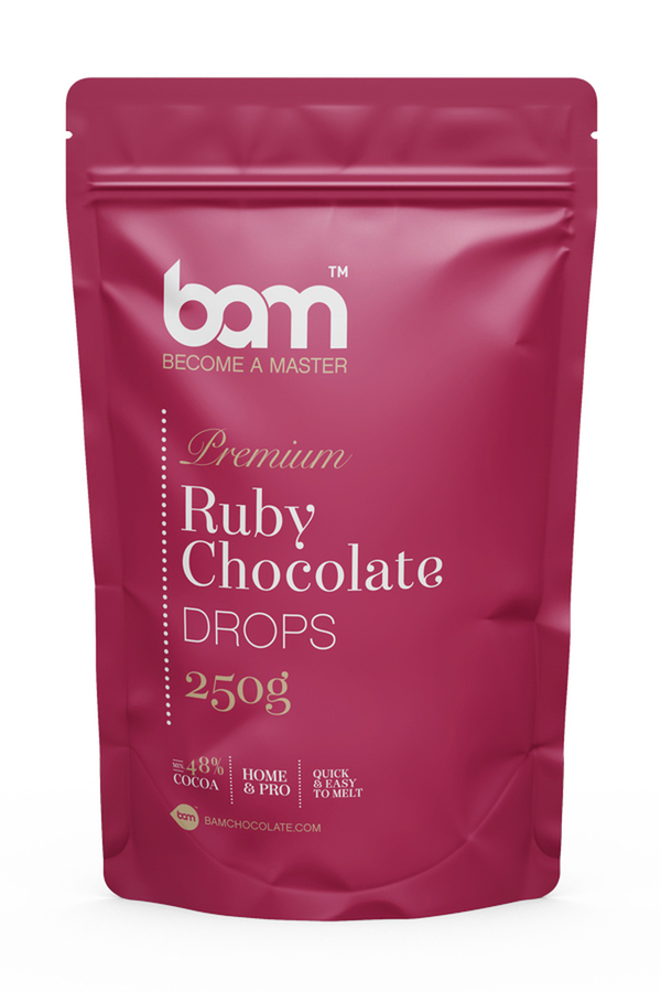 BAM Ruby Schokolade ist Premium rosa Schokolade. Die natürliche rosa Farbe wird durch eine besondere Sorte von Kakaobohnen erzeugt. Sie wachsen in Ecuador, Brasilien und der Elfenbeinküste. Sie hat einen ganz besonderen Geschmack, der weder bitter, noch milchig, noch süß ist, sondern einen leicht cremigen und fruchtig-säuerlichen Beerengeschmack aufweist. Durch die kleinen Tropfen lässt sie sich sehr leicht und schnell schmelzen und genau dosieren. Die Schokolade enthält keine Farb- oder Duftstoffe und hat einen fruchtig-säuerlichen Geschmack. Sie kann verwendet werden zur Herstellung von Cremes, Wraps, Pralinen und andere Süßwarenkreationen. Ruby-Schokolade beeindruckt jeden und befriedigt selbst die anspruchsvollsten Naschkatzen.