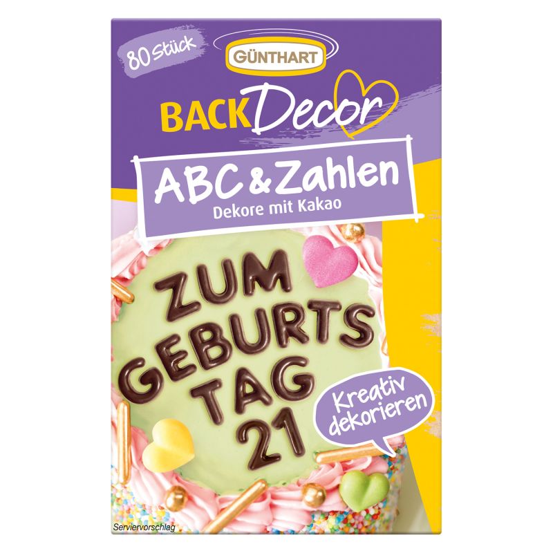Dekoration ABC und Zahlen von der Marke Günthart sind essbare Verzierung aus kakao-basiertes Fingering? Wait. Need accurate: "z kakaové polevy" = Kakao-Glasur. So translate: