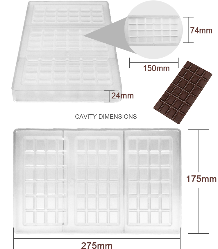 Polykarbonátová forma na čokoládu pro profesionální i domácí použití. Polykarbonát zajišťuje lesklý a dokonalý konečný výsledek. Čokoládu je třeba před nalitím do formy dobře temperovat. Formát tvaru: 275 x 175 mm. Připravit v ní můžete 3 tabulky najednou.