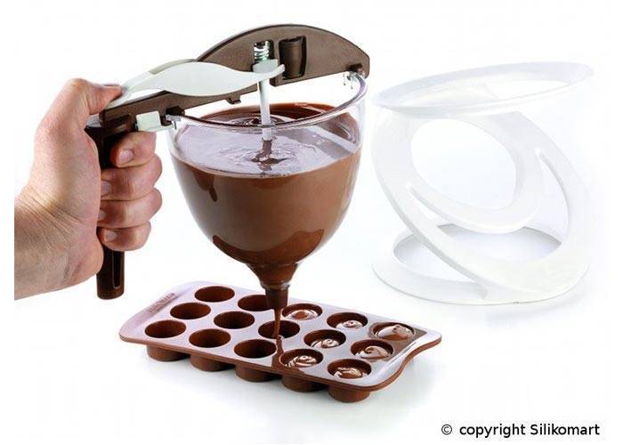 Der Behälter erleichtert Ihnen die Herstellung von Pralinen. Sie stellen den Behälter auf den Ständer und gießen die Schokolade hinein. Drücken Sie den Behälter leicht zusammen, um eine kleine Menge Schokolade in die Formen zu geben.