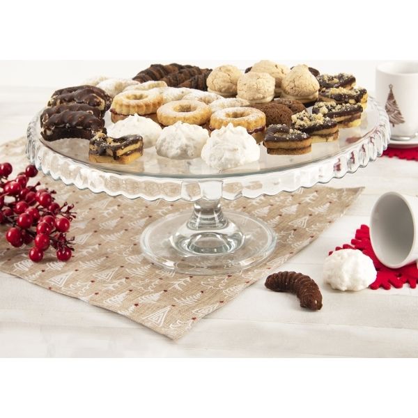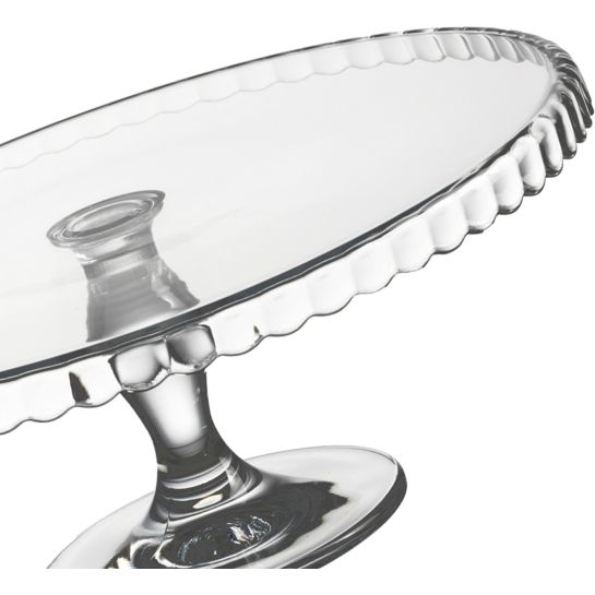 Tablett auf einem Fuß mit dekorativem Rand - ideal zum Servieren von Kuchen, Muffins, Torten, Desserts... Material: Glas. Maße: Durchmesser 32 cm, Höhe 11,5 cm. Sie können es mit einem Glasdeckel aus unserem Angebot ergänzen - 128356 oder 128328.