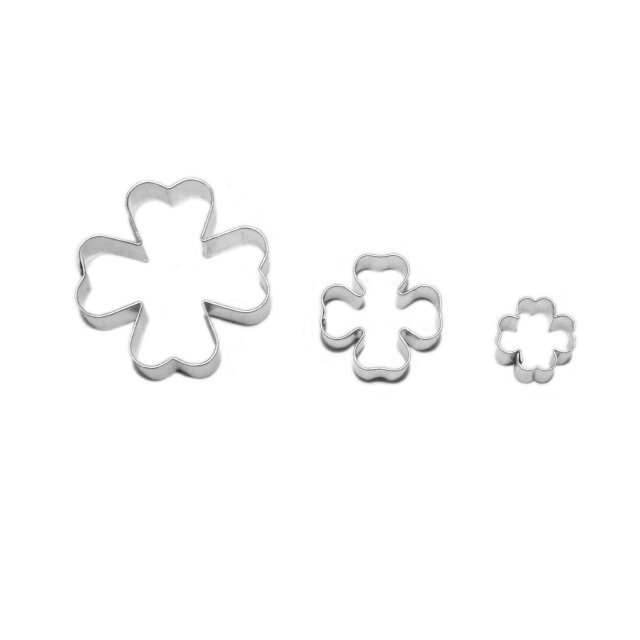 Ausstechformen aus Zinnfolie in Form eines vierblättrigen Klees in drei Größen.