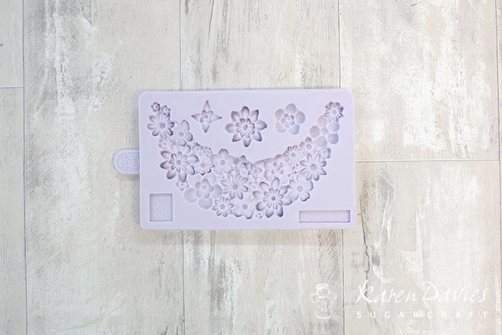 Silikonform für die Herstellung einer Blumengirlande aus Marzipan.