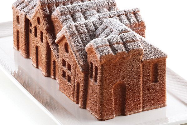 3D-Form in Form eines Dorfes. Ideale Form für Mousse au Chocolat. Die Form ist gefrierbar, die Form ist nicht zum Backen geeignet, sie enthält einen Kunststoffteil ( der die Silikonform hält, die in zwei Teile geteilt ist ). Der Silikonteil, ohne den Kunststoff hält nicht. Die Form ist nur für gefrorene Desserts geeignet. 218mm x 85mm 1200ml.