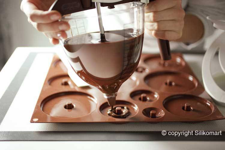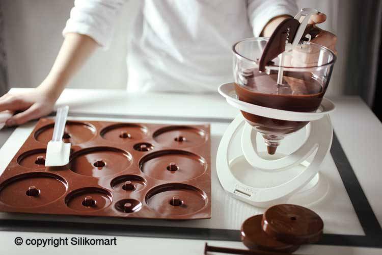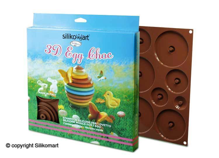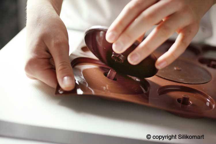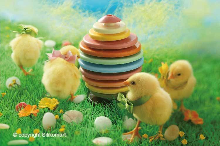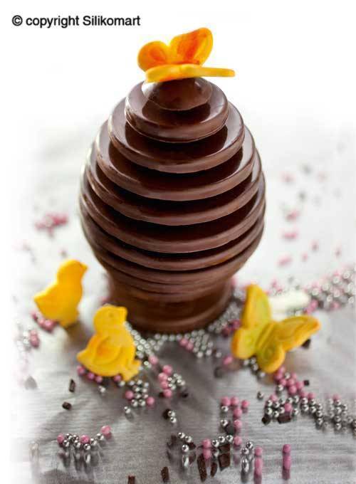 Mit diesen Formen können Sie zwei Arten von 3D-Ostereiern herstellen. Gießen Sie einfach die Schokolade in die Form, lassen Sie sie fest werden und stapeln Sie dann die Teile auf den Ständern. Du kannst auch mit verschiedenen Farben der Schokolade spielen.