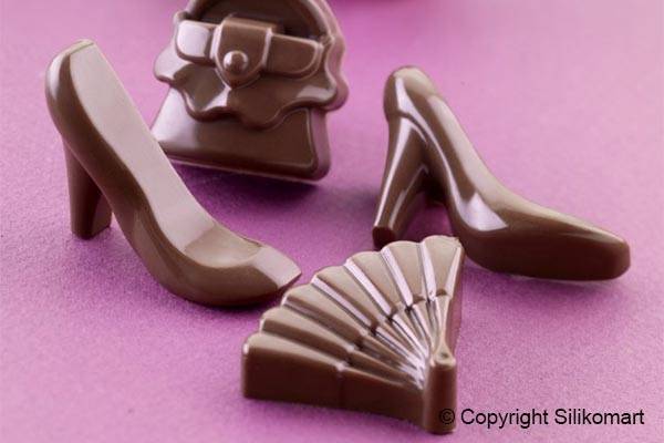 Hochwertige Silikonform für 14 Bonbons mit Motiven von Stöckelschuhen, Fächer und Handtasche.