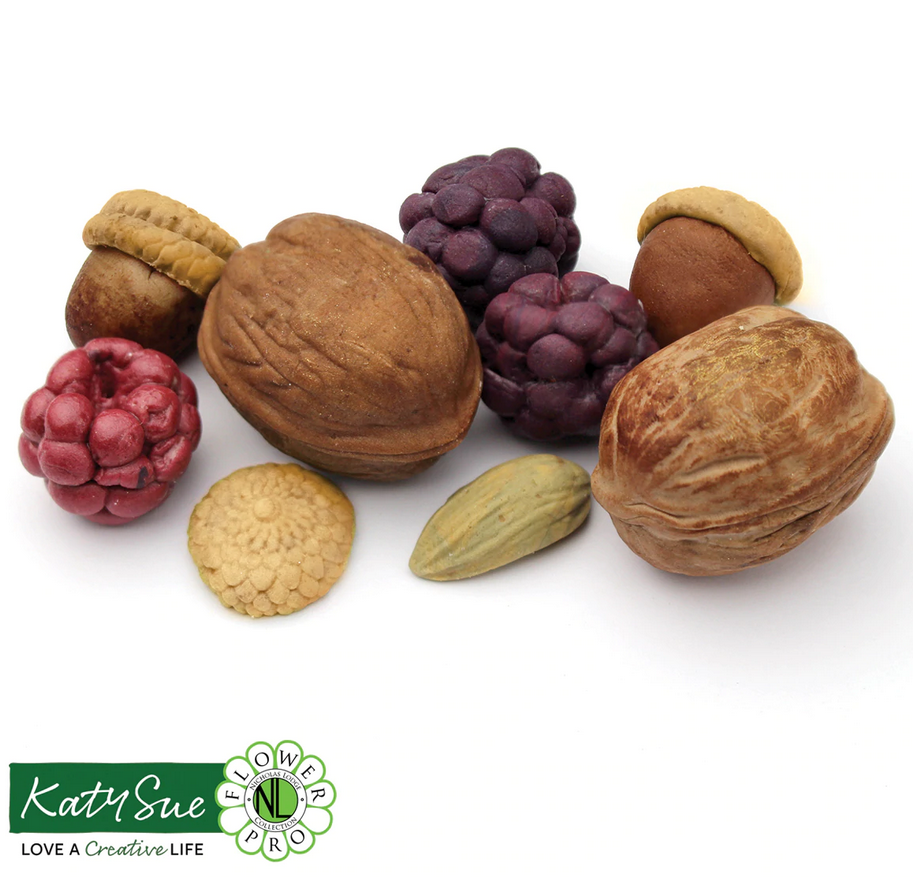 Diese Form von Katy Sue wurde in Zusammenarbeit mit dem Meisterkonditor Nicholas Lodge entwickelt. Mit dieser Form können Sie Mandeln, Walnüsse, Eicheln und Beeren herstellen, die sich hervorragend zum Dekorieren von Torten, Cupcakes und vielem mehr eignen. Das fein ausgearbeitete Design dieser Form sorgt jedes Mal für perfekte Ergebnisse. Die Form ist einfach zu benutzen und kann mit Zuckerpaste, Blütenpaste, Modelliermasse, Marzipan, Schokolade, Kandis und gekochtem Zucker verwendet werden. Darüber hinaus kann die Form auch für Bastelprojekte verwendet werden. Sie können sie auch für Kaltporzellan, Salzteig, lufttrocknende Tonerde und Prägepulver verwenden. Wir empfehlen, die Form für Lebensmittelprojekte oder für Bastelprojekte zu verwenden, nicht für beides. Anwendung: Drücken Sie Fondant in die Form, ohne sie zu überfüllen. Überschüssigen Fondant abkratzen, um die Kontur zu sehen. Vorsichtig drehen, um die Dekoration zu lösen. Leicht mit Maismehl bestäuben, um die Paste zu lockern. Waschen und trocknen Sie die Form vor dem Gebrauch gut ab. Die Form ist ofenfest (bis zu 200°C) und spülmaschinenfest. Katy Sue-Formen bestehen aus lebensmittelechtem Silikon und werden in unserer eigenen Fabrik in Großbritannien hergestellt. Abmessungen. Größe Walnuss: ca. 3 x 2,4 cm. Größe der Eichel: ca. 2,5 x 1,7 cm. Größe der Eichelkappe: ca. 1,5 x 1,5 cm. Größe der Beerenkombination: ca. 1,8 x 2,2 cm.