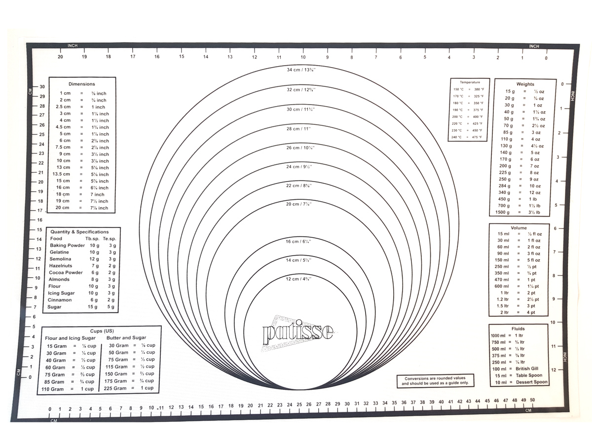 Die Patisse Silikonbackmatte ist eine praktische Backmatte, die sich ideal zum Ausrollen von Fondant, Marzipan oder Keksteig eignet. Die Backmatte zeigt die Maße an und erleichtert so das Ausrollen der gewünschten Größe.