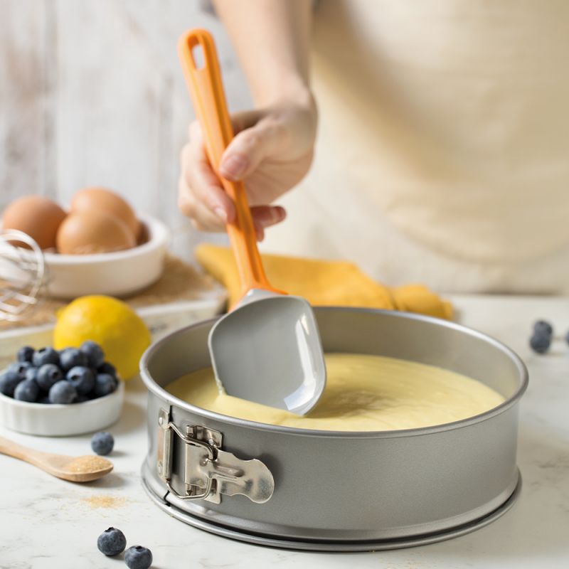 Küchenutensilien aus 100% Platinsilikon mit ergonomischem Kunststoffgriff. Unverzichtbar zum Kneten jeder Art von Teig, geeignet für süße und herzhafte Speisen. Mit abgerundetem, flexiblem Rand zum einfachen Auffangen von Teigresten auch in kleineren Behältern. Stiel: 19,5 cm Spatel: 8 cm